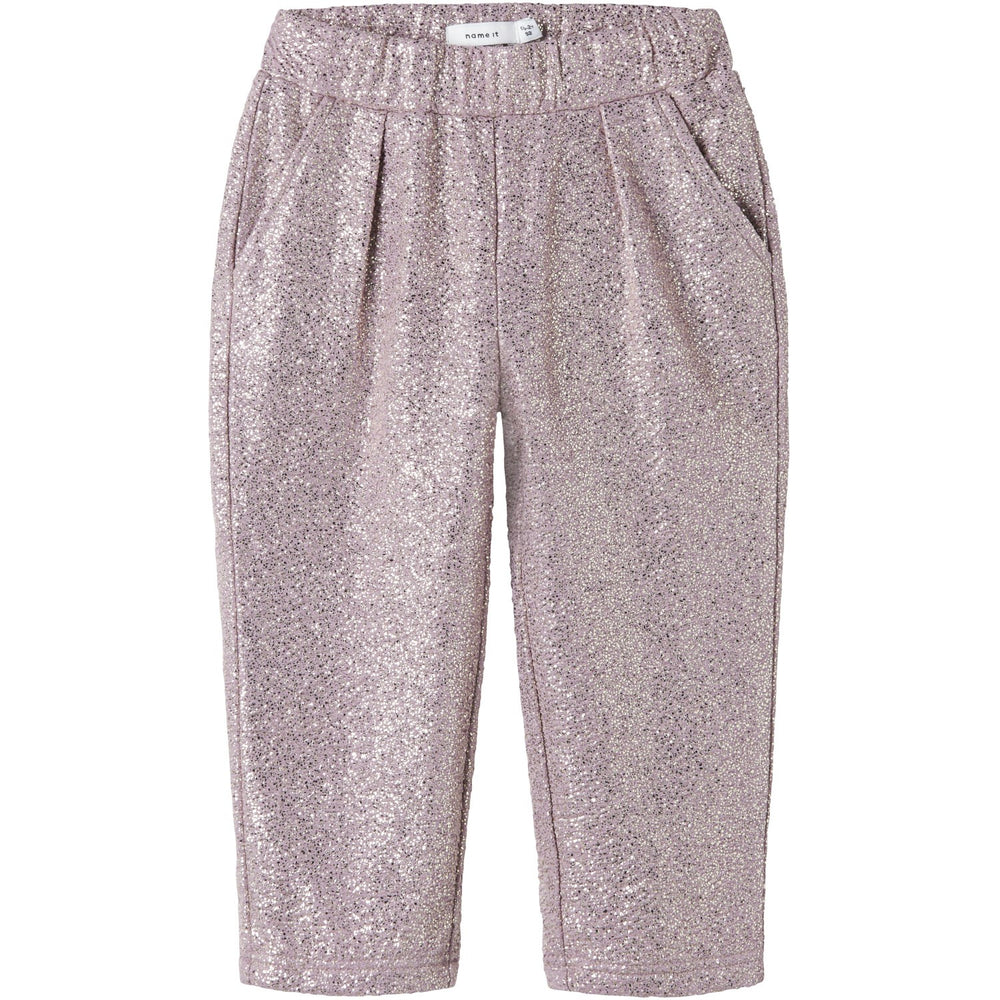 Tilføj en stilfuld detalje til din lille éns garderobe med Name It Keepsake Lilac Nmfrditsa Bukser. Disse bukser kombinerer funktionalitet og stil med praktiske sidelommer og en iøjnefaldende glitterdetalje. Fremstillet for komfort med en afslappet pasform, de er ideelle til daglig brug og bevægelige legeaftener.