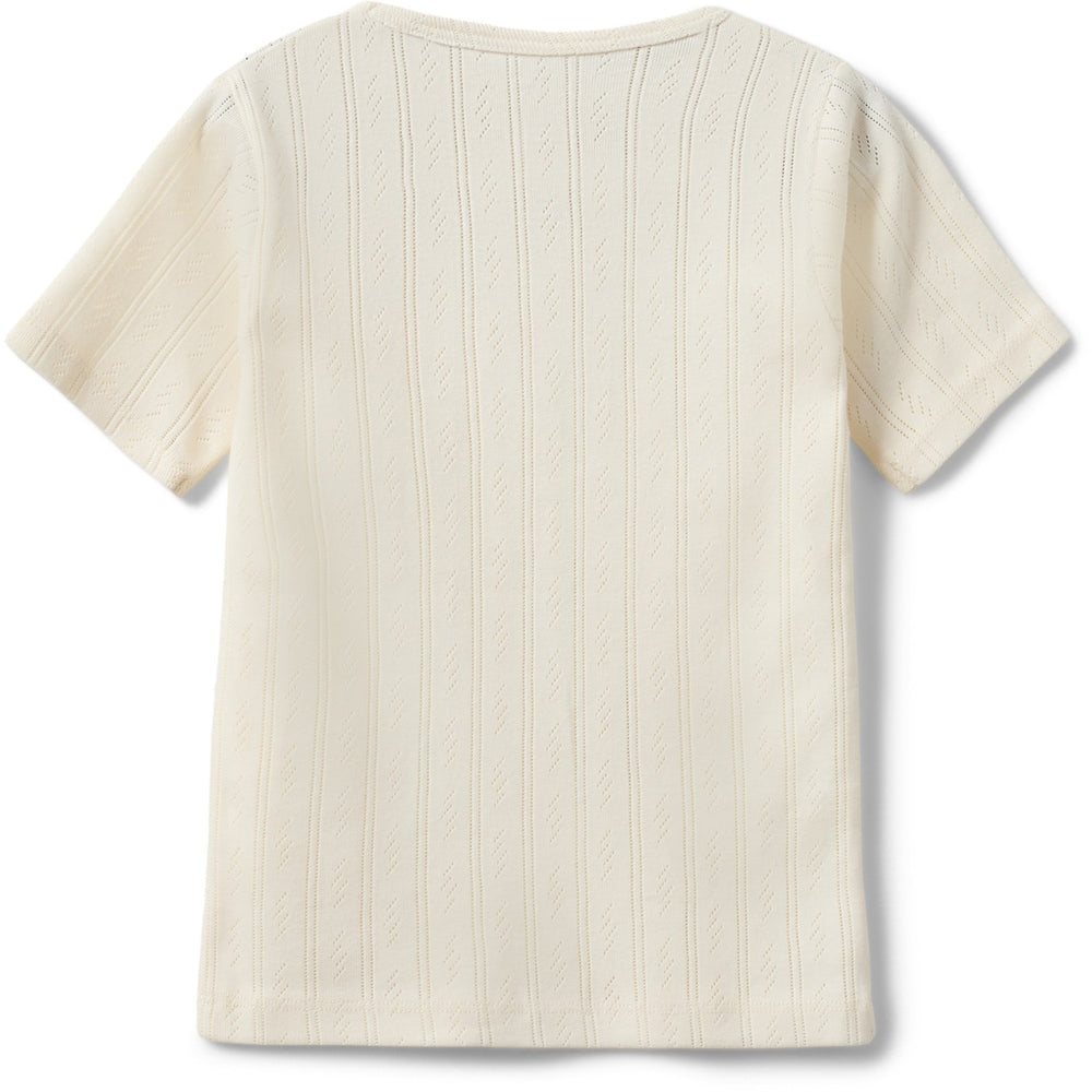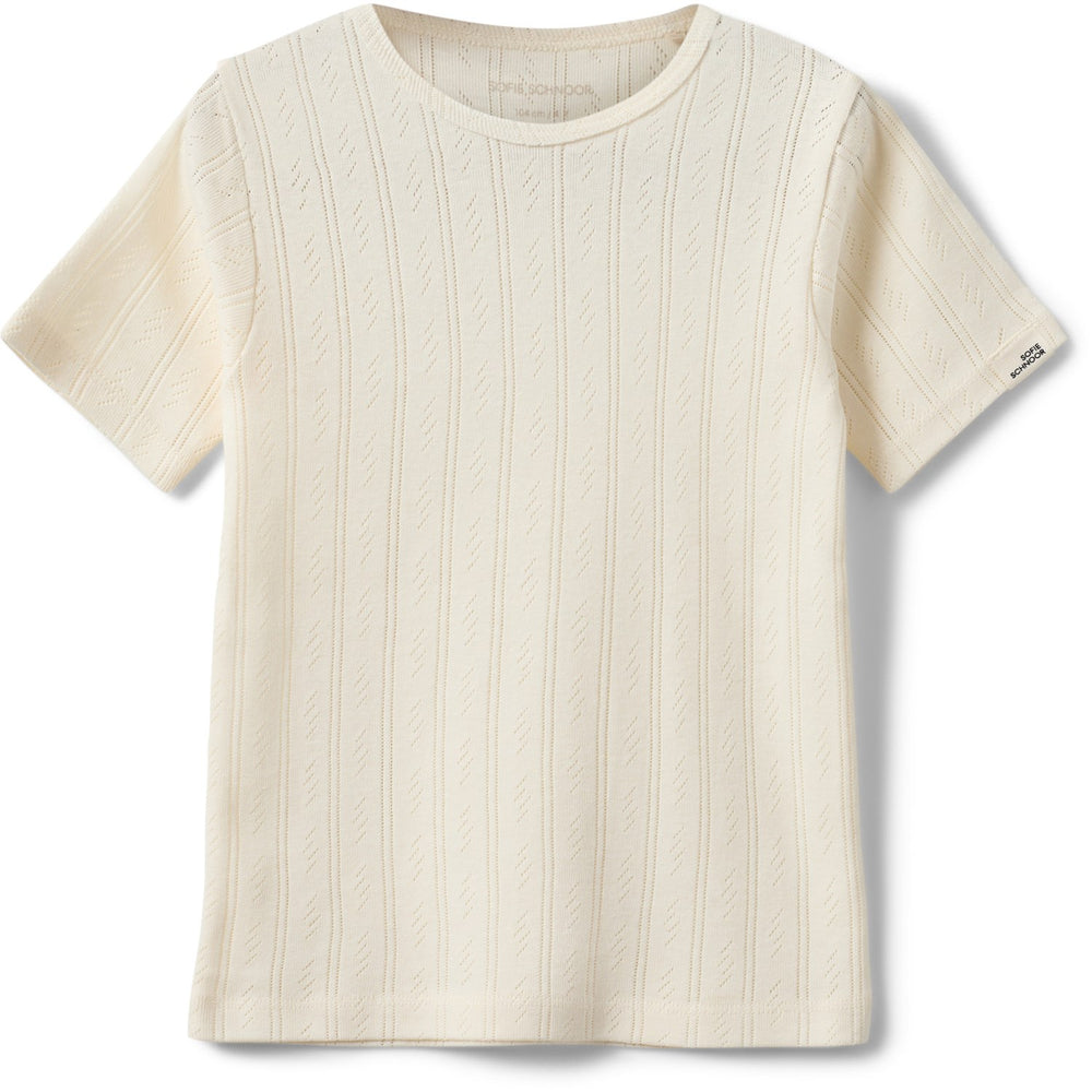 Velsiddende og charmerende, denne T-shirt fra Sofie Schnoor er fremstillet i blødt økologisk bomuld. Den udsøgte off-white farve komplementeres af et delikat pointelle print, der tilfører stil og karakter. T-shirten er designet til at give optimal komfort og bevægelsesfrihed til dit barn, hvilket gør den ideel til både leg og afslapning. Perfekt til hverdagsbrug og kan nemt kombineres med andre beklædningsdele.