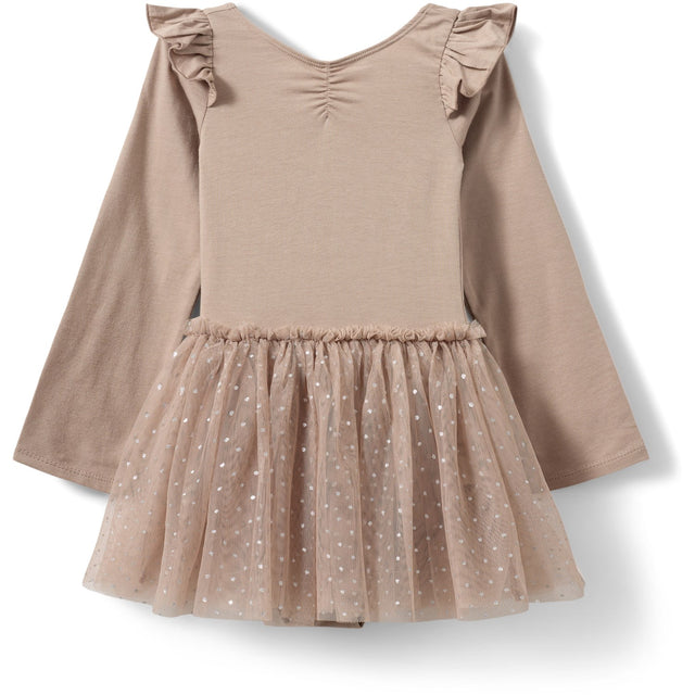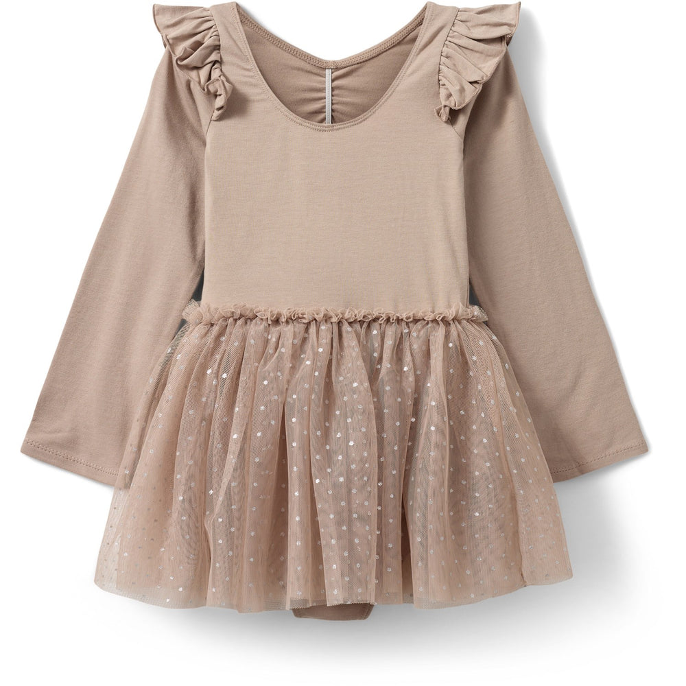 Denne charmerende gymnastikdragt fra Sofie Schnoor er perfekt til din lille danser eller gymnast. Designet i en delikat gammelrosa nuance med et øjefangende glimmerskørt og dekorative flæser ved skuldrene, kombinerer den stil med funktionalitet. Fremstillet for komfort og holdbarhed, sikrer den en perfekt pasform og fri bevægelighed under alle aktiviteter.