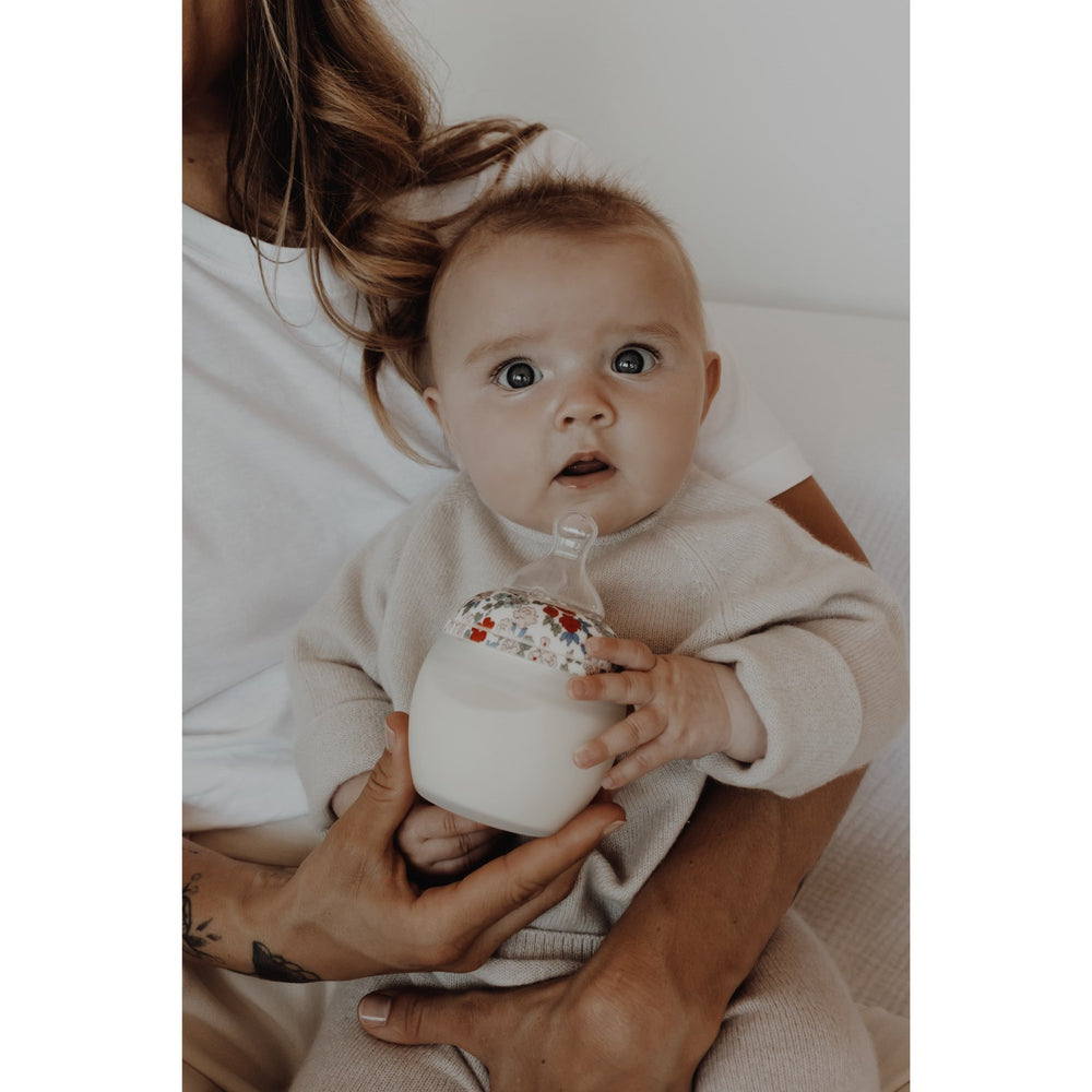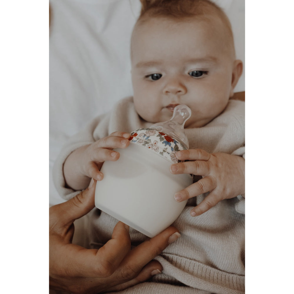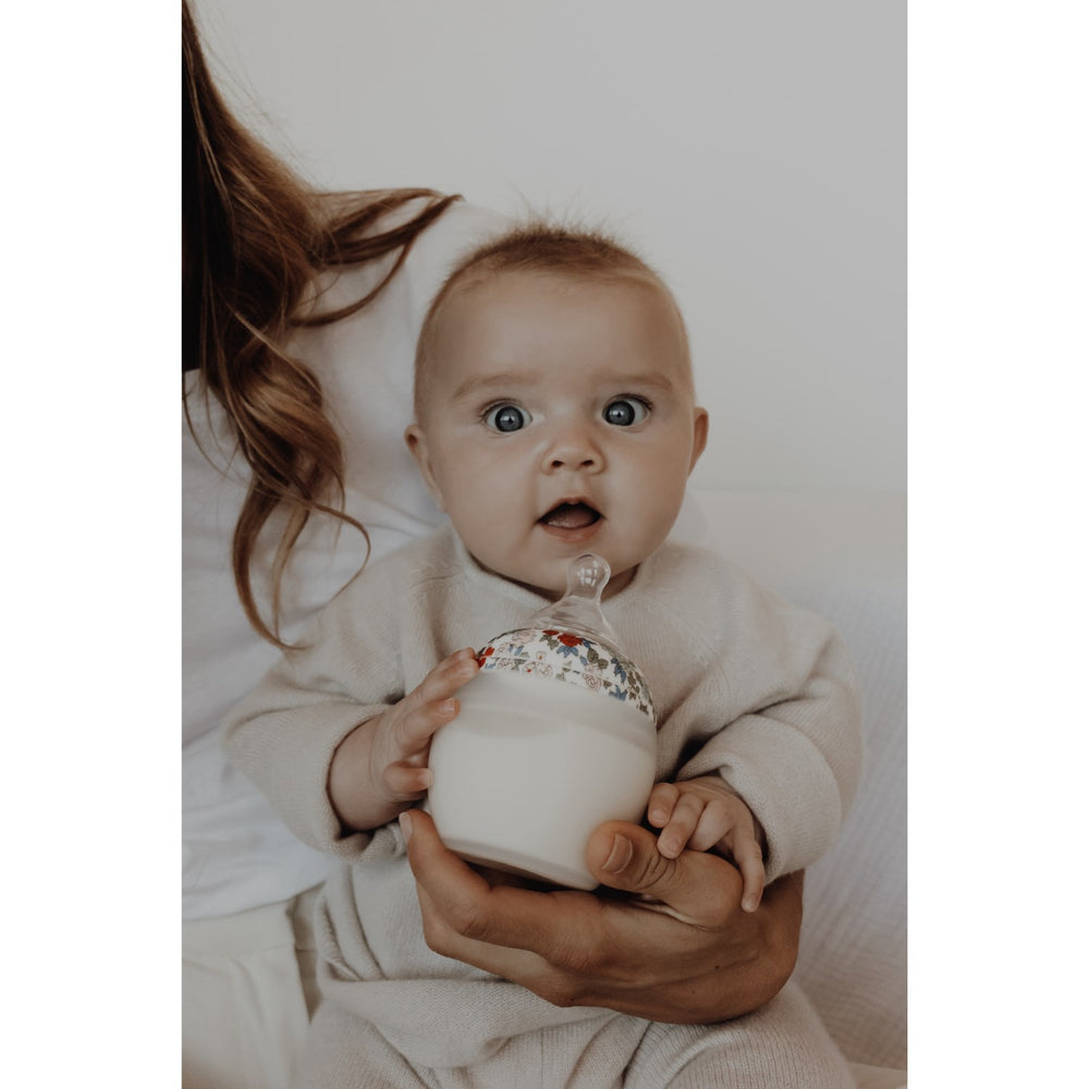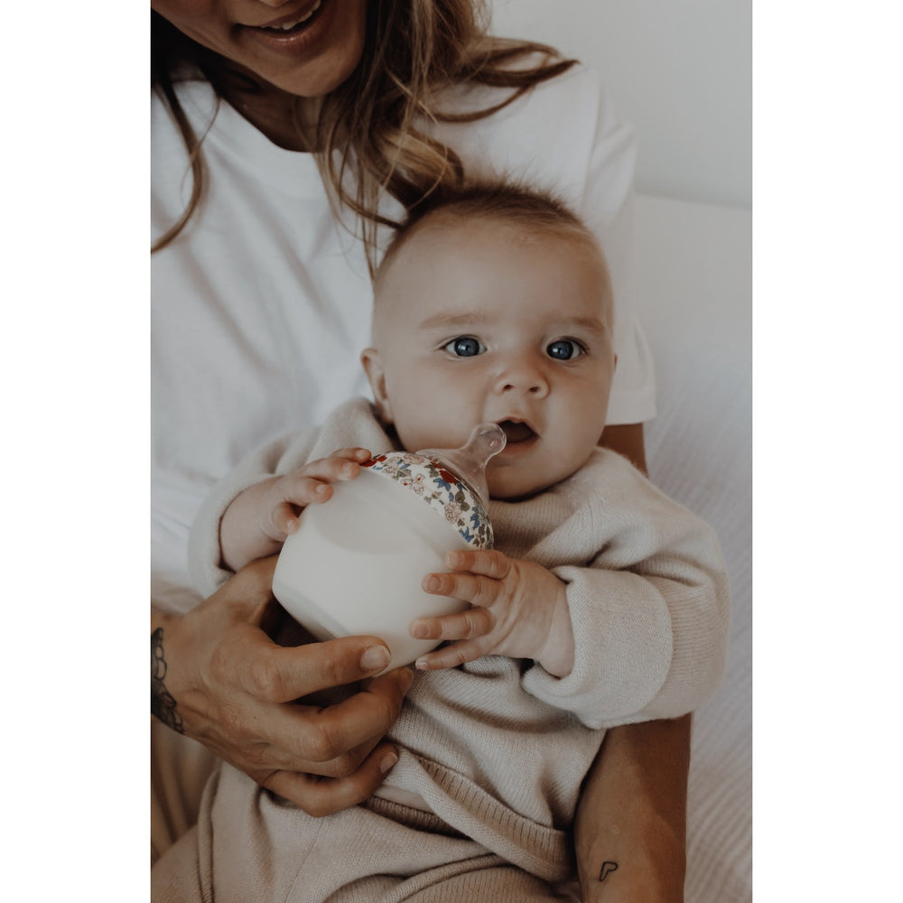Giv din baby en naturnær oplevelse med That's Mine X Élhée Bittersweet Collab Baby Flaske. Denne 240 ml sutteflaske er lavet af blød, fleksibel silikone, der efterligner følelsen af at amme, hvilket gør overgangen mellem bryst og flaske smidig og behagelig. Flasken er designet til at reducere risikoen for babyens indtag af mikroplast, sikrende et sundere miljø ved måltiderne. Ideel til den moderne, bevidste familie, der værdsætter sikkerhed og komfort for deres lille.