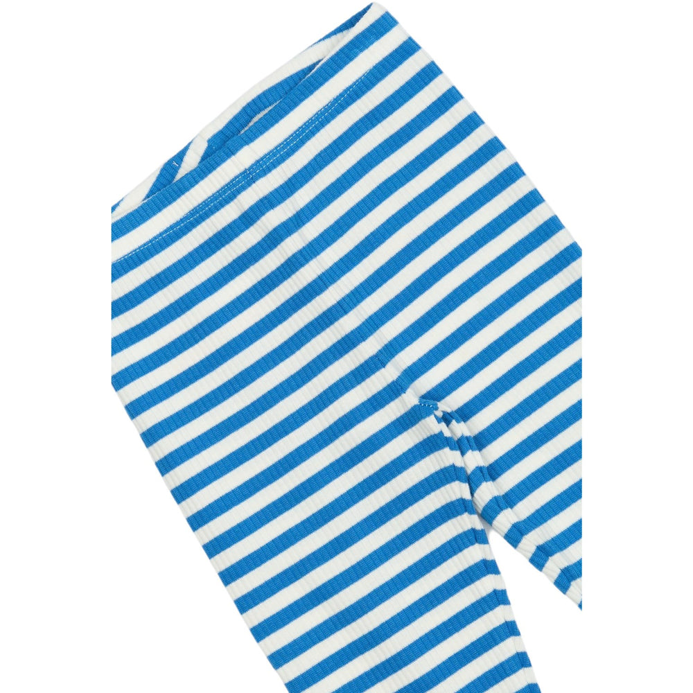 Disse ribstrikkede leggings fra THE NEW Siblings i blå og hvide striber kombinerer stil med komfort. Fremstillet i GOTS certificeret økologisk bomuld, sikrer de en blød og behagelig følelse mod barnets hud. Modellen har en fleksibel elastik i taljen, der tilpasser sig barnets bevægelser, ideelt til leg og udforskning. De passer perfekt med en matchende TNSTFro-t-shirt for et charmerende sæt. Perfekte til hverdagsbrug og lette at vedligeholde.
