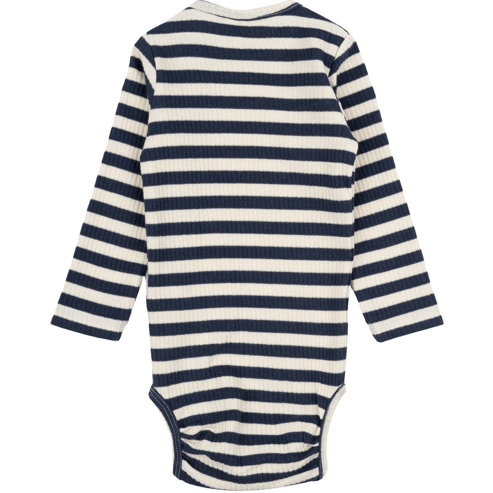 Forkæl din lille én med THE NEW Siblings Mood Indigo Striped Fro Uni Rib Body. Denne bodystocking i ribbet stof tilbyder en fremragende pasform takket være elastisk økologisk bomuld, der sikrer miljøvenlig komfort. Det stribede design i indigoblå nuancer giver en livlig stil, ideel til leg og læring. Velegnet til maskinvask for nem vedligeholdelse.