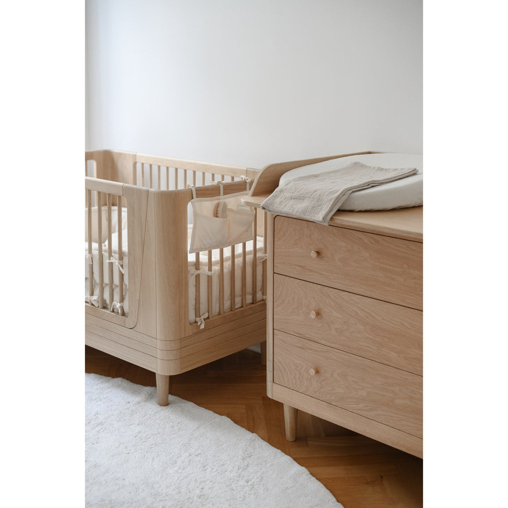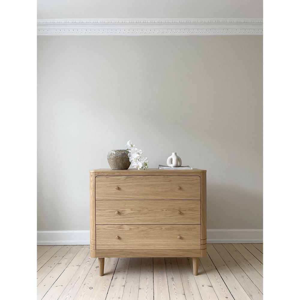 Denne Nature kommode fremstillet i massivt egetræ tilbyder soliditet og tidløst design, der harmonerer med enhver børneværelsesindretning. Med tre rummelige skuffer leverer den optimal opbevaringsløsning til alt fra tøj til legetøj, hvilket gør daglig organisering let og overskuelig for forældre. Den klare, matte lak sikrer lang holdbarhed og en sikker overflade fri for skadelige stoffer, testet efter EN 71-3:2019 + A1:2021 standarder. Nem at omforme til en puslekommode uden synlige mærker - ideel fra baby til teen. Denne kommode er ikke blot et møbel, men en investering i dit barns voksende verden. Alder: Fra nyfødt Materialer: Massivt egetræ, Egefinér, Klar mat lak Mål: 120 x 88 x 24 cm