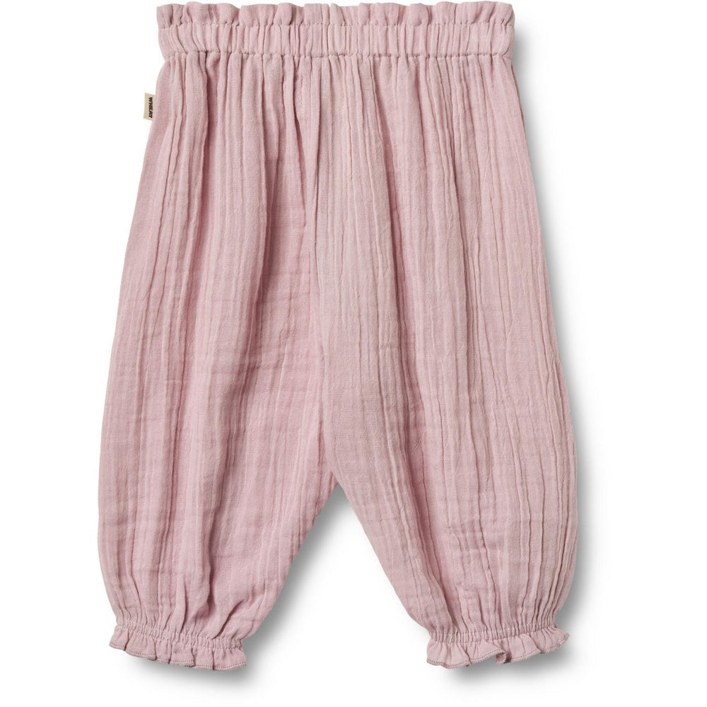 Disse bløde Wheat Lavender Mist Bukser Petrine er fremstillet i 100% økologisk bomuldsgaze, der sikrer din babys komfort. Designet med en løs, hævet pasform og justerbare elastikker i taljen samt ved benkanterne, tilbyder de fleksibilitet og en perfekt pasform. Rynkedetaljerne og den dekorative bomuldsblonde tilfører et stilfuldt flæselook. Ideelle til både hverdagsbrug og specielle anledninger, disse bukser kombinerer funktionalitet med et charmerende design. Certificeret af OEKO-TEX® Standard 100 og GOTS, du er garanteret et høj kvalitetsprodukt uden skadelige stoffer.