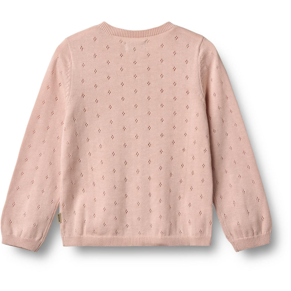 Denne langærmede strikkede cardigan fra Wheat, fremstillet i 100% økologisk bomuld, tilbyder optimal komfort og blødhed der er skånsom mod barnets hud. Med sit lette A-formede snit og klassiske design, inklusive et charmerende hulmønster og praktiske frontknapper, sikrer cardiganen en både stilfuld og behagelig pasform. Ribkanten ved halsudskæringen, manchetterne og forneden giver en fin finish og holder på varmen. Dette miljøvenlige valg er GOTS-certificeret, sikrer høj kvalitet og er fri for skadelige stoffer, bekræftet ved OEKO-TEX® Standard 100. En ideel løsning til hverdagsbrug og kan let kombineres med andre items for et varmt lag under koldere dage.